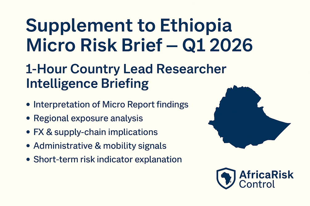 This is a separate, complementary service to the Ethiopia Micro Risk Brief — Q1 2026. The 1-hour call with ARC’s Country Lead Researcher helps you: • Interpret the brief’s political, FX, and security findings • Apply insights to your sector or operational context • Clarify regional differences and short-term risks • Validate assumptions or upcoming decisions • Receive tailored guidance based on ARC’s field intelligence A booking link is included in the Ethiopia Micro Risk Brief — Q1 2026 you purchased.